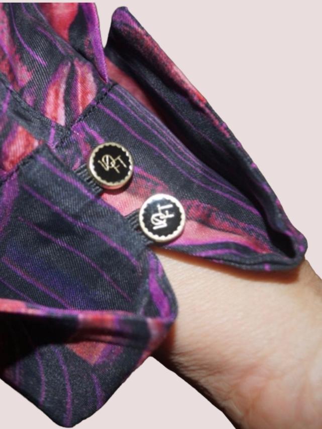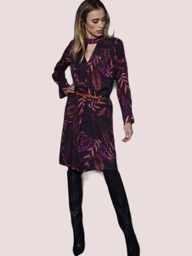 10 Feet Dress 800083 Blackberry. This botanically printed dress is crafted from a soft premium cupro blend. The dress has long sleeves with signature buttons and a unique neckline. The dress is closed with a button closure at the back.