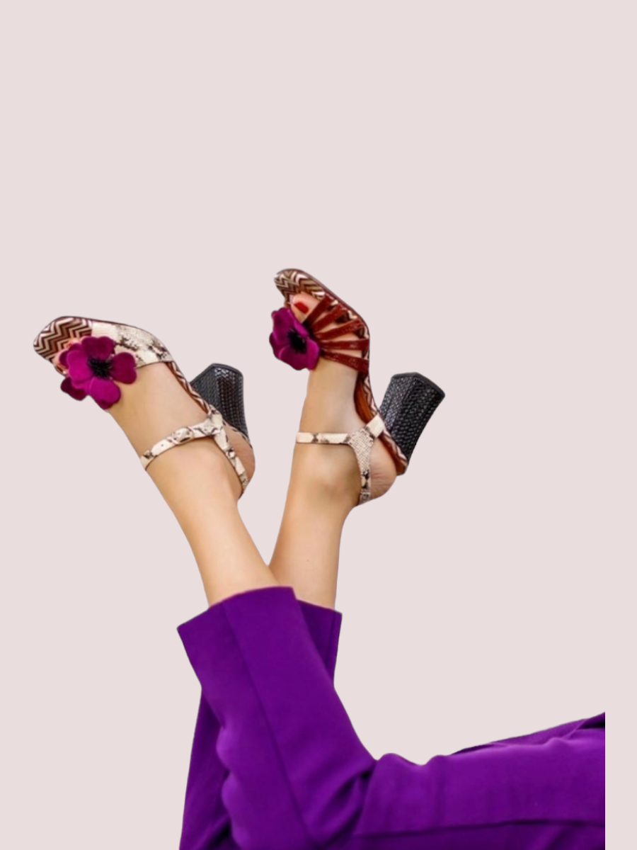 Patenteffect op leer Krokodilreliëf op leer Heel zacht suède Zacht leer met een geometrische print Zeer zacht leer met een geweven effect Terra, lichtbruine, paarse en zwarte kleuren Hakhoogte: 7cm bij maat 37 gemeten in het midden van de hiel NIET aan de achterkant. De hoogte neemt proportioneel toe met de schoenmaat Zeer zachte leren voering Gesp-sluiting Zelf bedekte hiel Leren zool met anti-slip rubberen stuk aan de onderkant